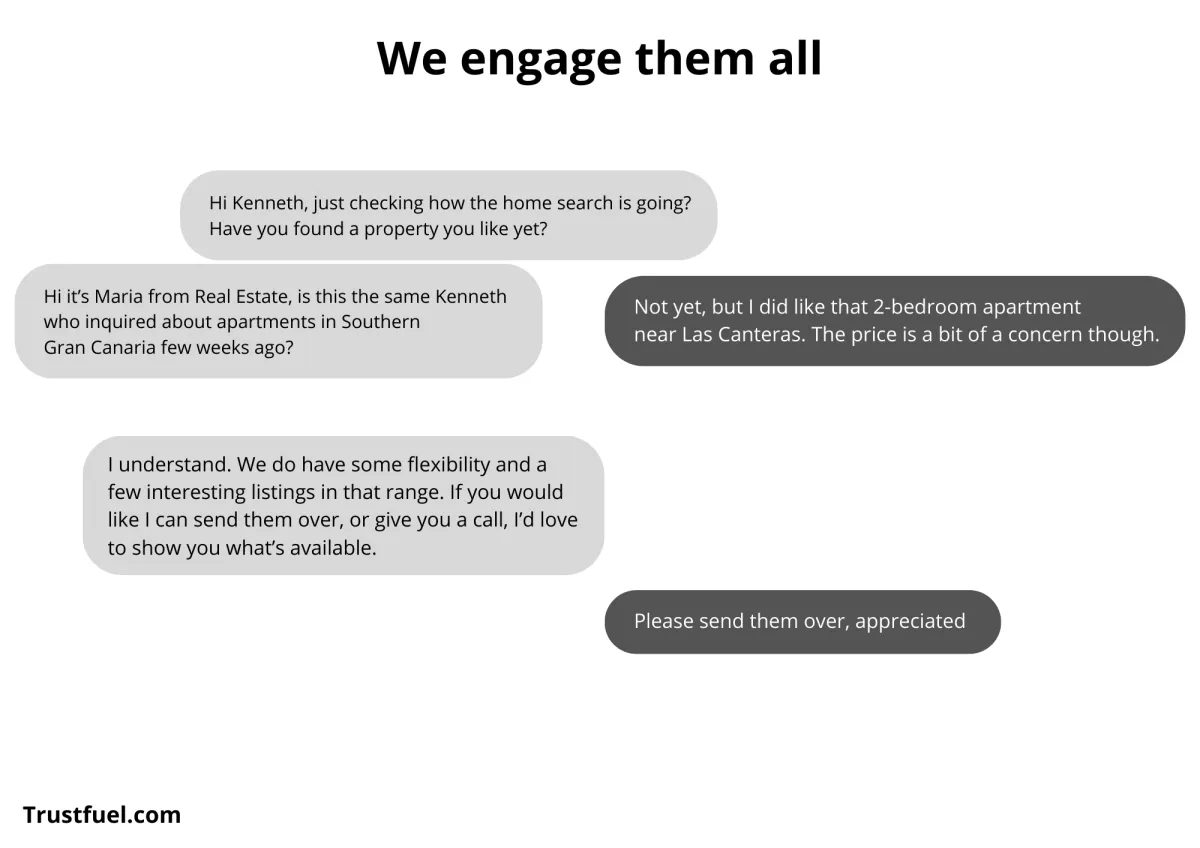 AI + SMS/WhatsApp Responds → Human-like messages engages and helps the prospect right away, books them in, schedules a call etc.